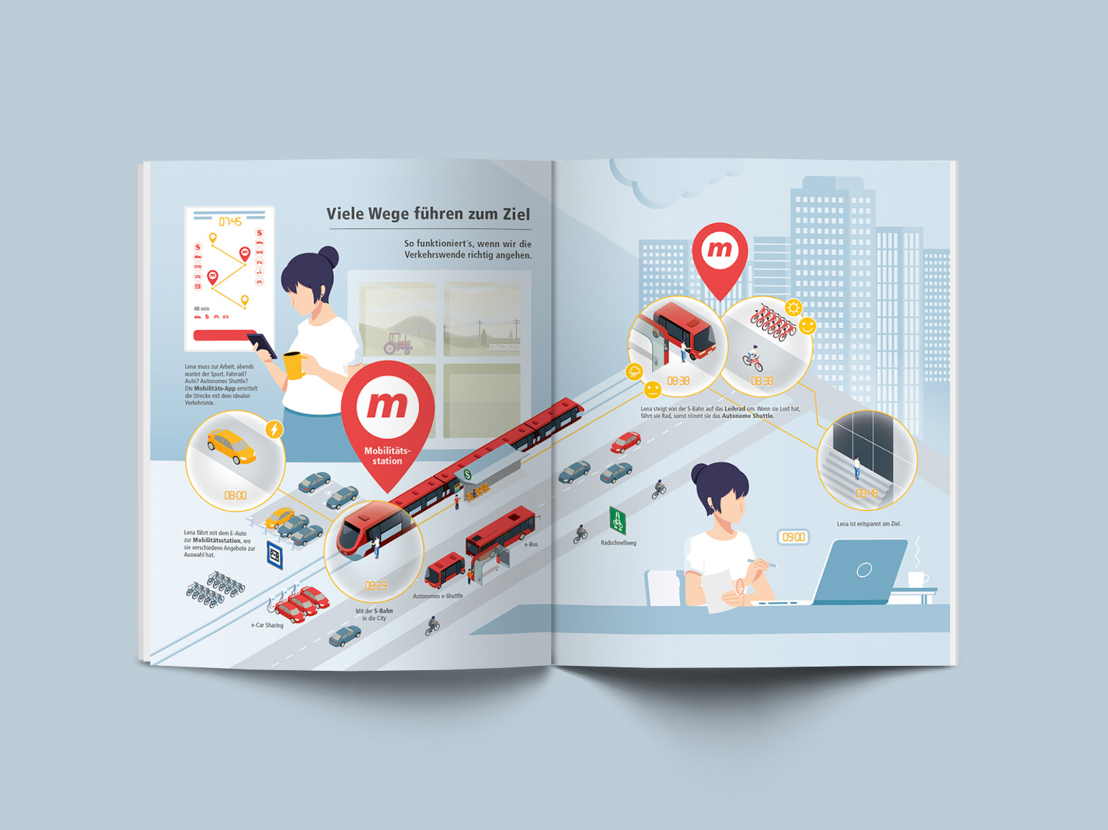 Infographic for Auto Club Europas monthly magazine about smart mobility concepts for daily commuting in near future.